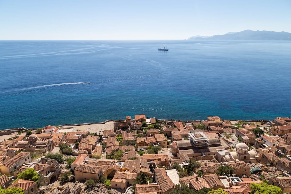 Monemvasia is a visually stunning castle town built into a majestic, large rock jutting out of the sea off the Peloponnesian coast. It is also the longest continuously inhabited castle town in all of Europe.