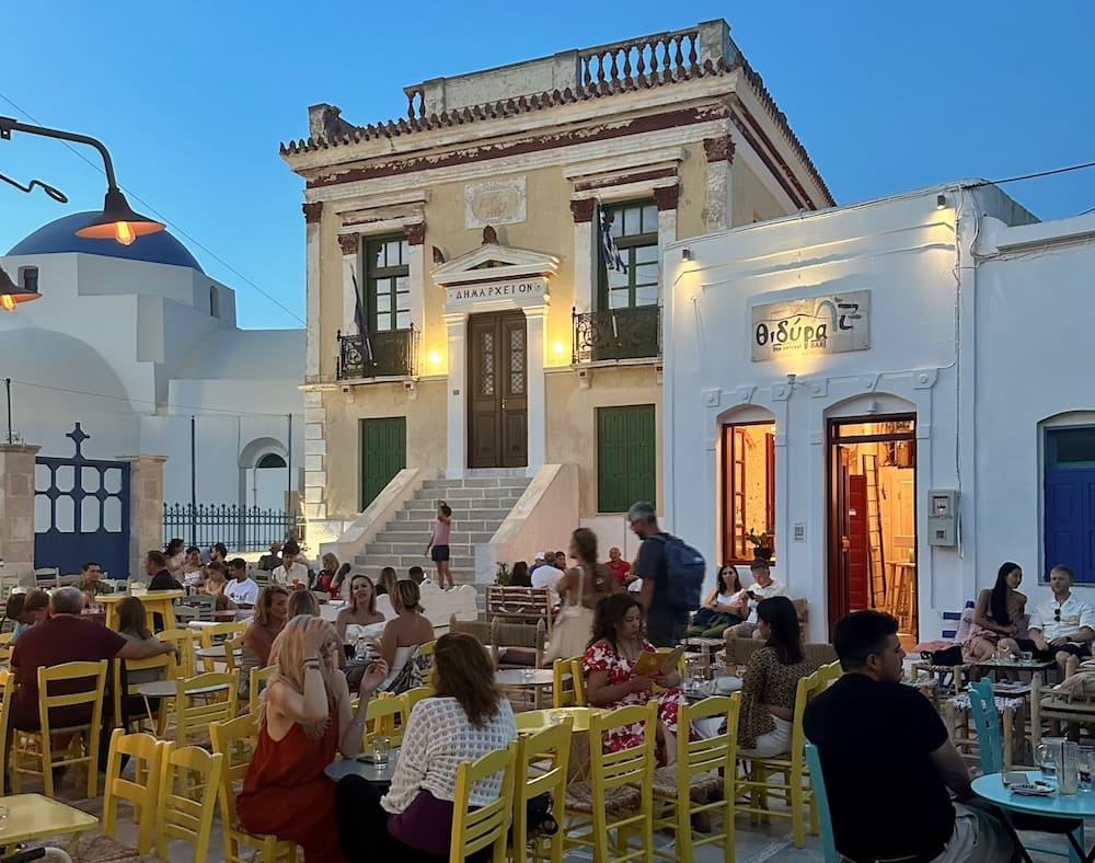 Walk amongst the brightly colored chairs and tables, in front of the neoclassical town hall and traditional whitewashed houses tinged with blue. This is one of the few open, airy spots in Ano (Upper) Chora, which has a lot of densely packed stores and houses otherwise.