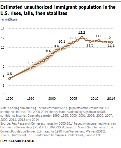 US Customs & Border Protection has recorded a rapidly decreasing number of apprehensions at the border over the past two decades. Apprehensions at the US-Mexico bordered totaled 1.64 million in 2000; they totaled only 303,916 in 2017. This is a HUGE drop that has been going on for years. In fact, most undocumented immigrants (75%) living in the US now have been here for over 10 years. This is also obvious in the stabilization of the undocumented immigration population recorded by the Pew Research Center.