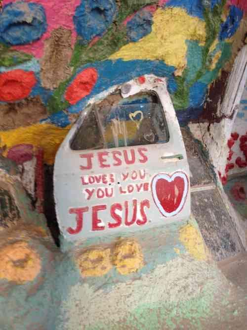 Old cars and furniture have been taken from dumps and redone to suit the Christian theme of the area. Waterfalls, flowers, suns, trees, and many other serene nature symbols are painted on the adobe clay walls (with donated paint, I later found out).