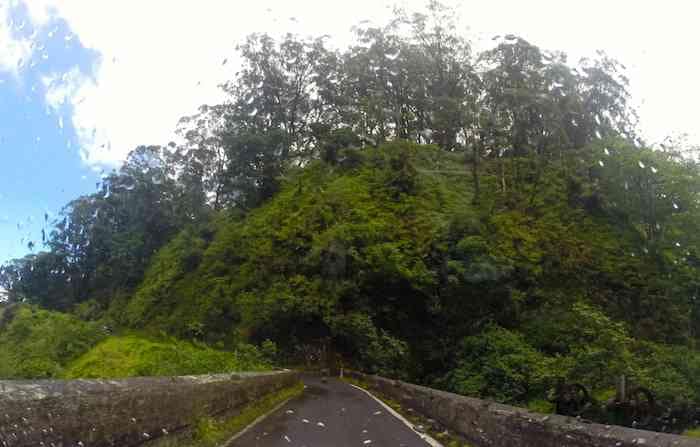 Back to the road. This is when we started the turn-intense portion of the journey. Stone bridges, jungle canopy above us, cliffs dropping down to the ocean. This was the adventurous road I had dreamed of when I first read about the Road to Hana. Rain started falling and slowed down our pace as the small storm passed over us, but as with most tropical storms, the sun came out again after just ten minutes.