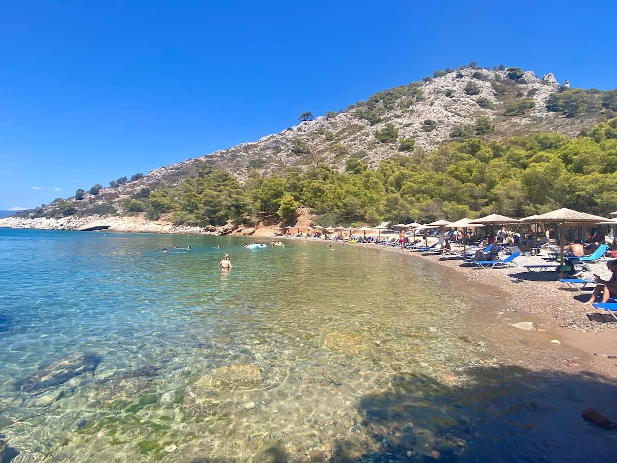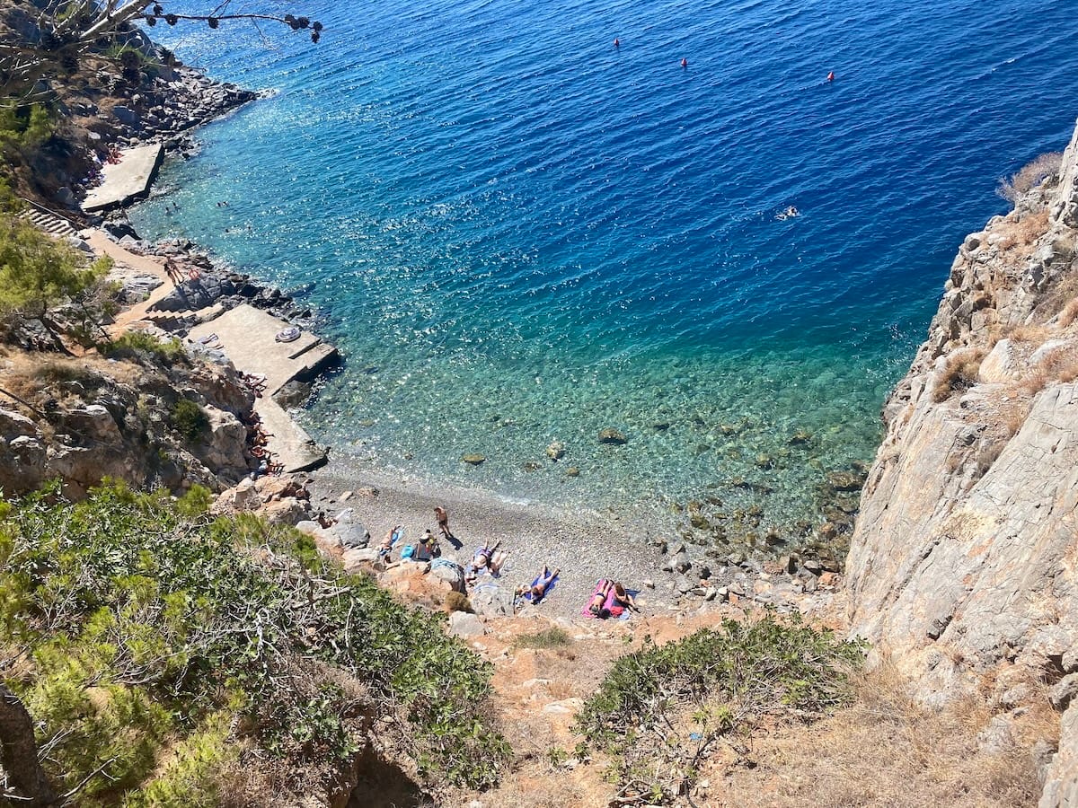 The actual “beach” part of this beach is very small, so get there early to get a spot. Otherwise, you may have to lay out on the stone platform right next to the pebbles. However, the water is just as beautiful as any beach on Hydra, Greece.