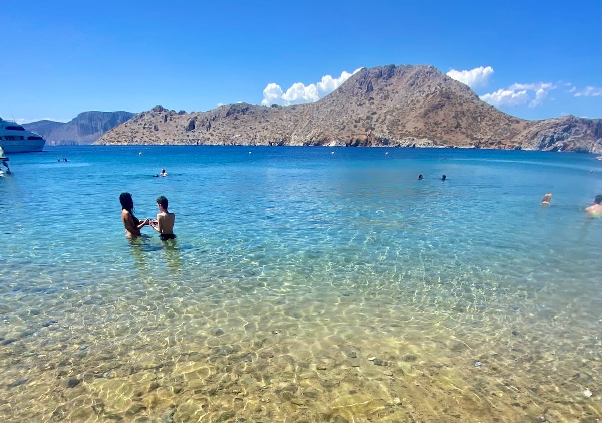 If you’d rather save money on the ferry and walk to a beach near the port, head to Avlaki Beach. It’s about a ten-minute walk on the footpath leading west out of town.
