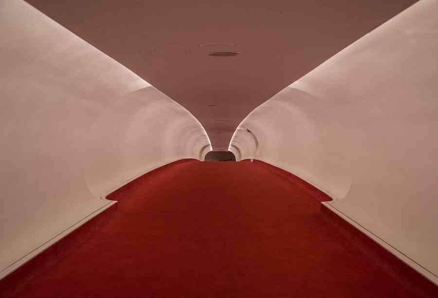 There are also exhibits of TWA flight attendant uniforms by era. The interior design features a beautiful 60s retro vibe and color scheme. The luxurious red carpeting covering many of the hallways adds a little touch of glamour as well.