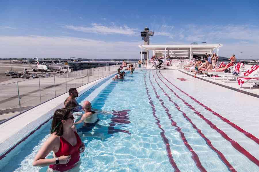We passed several hours on the observation deck by the rooftop pool drinking, swimming, tanning, and guessing which airline was taking off or landing next.